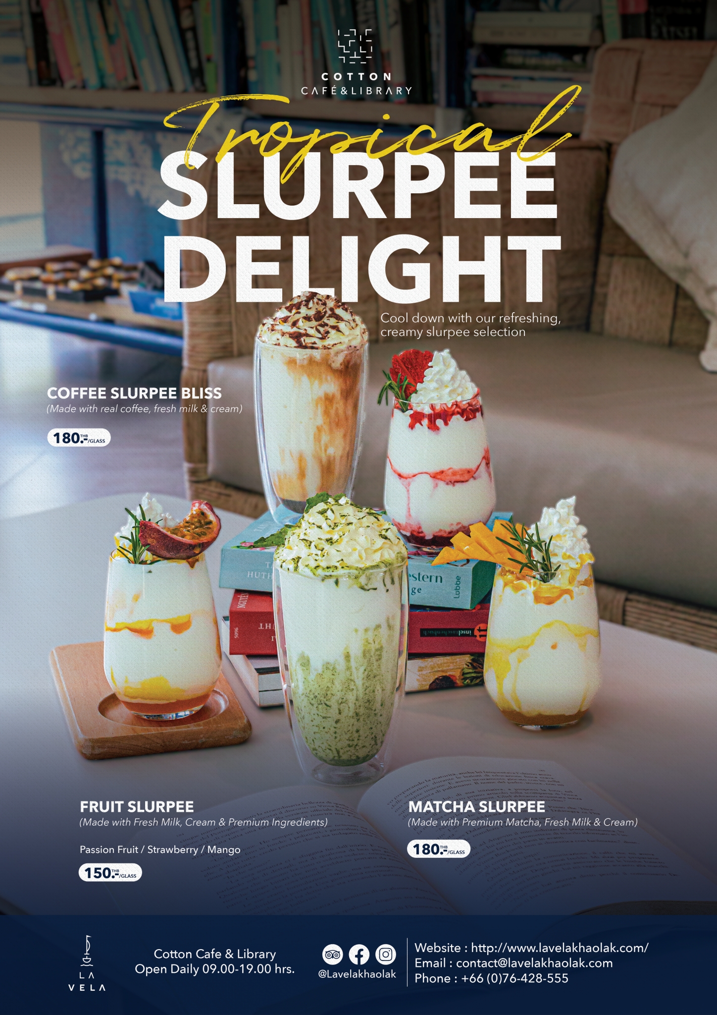 If you develop a thirst, drop by Cotton Café. Nowhere else captures the essences of taste and aromas better than Cotton Café, a spot with a laid-back vibe. Located by one of the pools, this place is where you will want to lounge, kick back and relax every afternoon. Here we serve up fresh salads, sandwiches, delectable confections and almost all kinds of drinks including freshly made espresso, coffee, smoothies and exotic teas. Whether it’s pure espresso or art latte, you can always trust our experienced baristas.